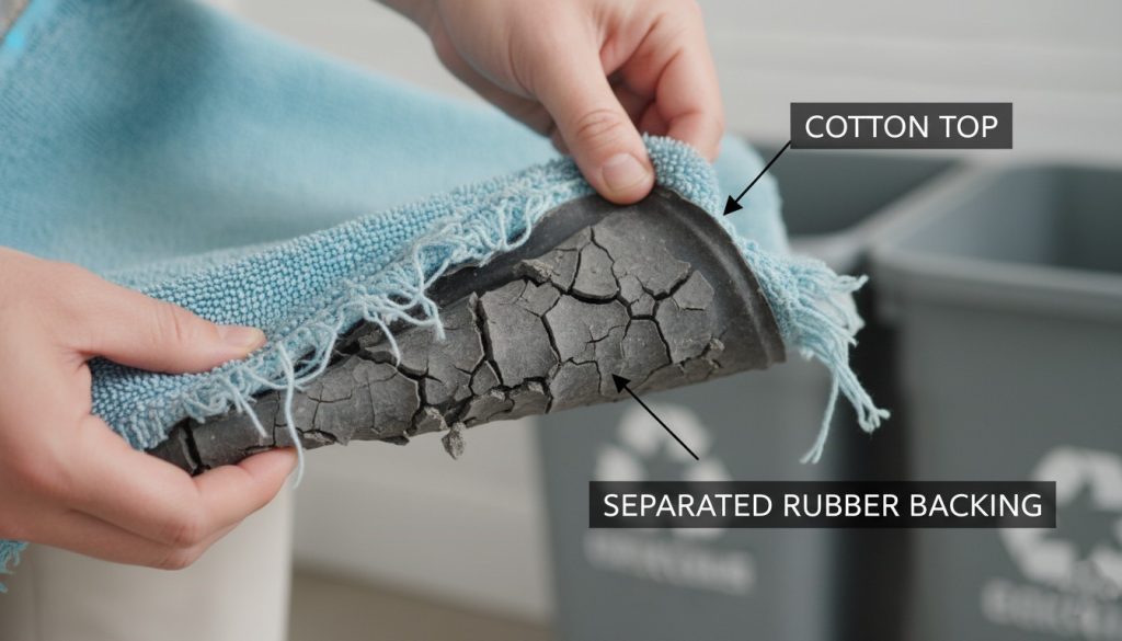 The rubber-backed mat was trickier. That rubber backing that prevents slipping in the bathroom becomes a nightmare for recycling facilities. Most standard textile recyclers won’t accept mats with rubber backing because they can’t easily separate the materials. I learned this the hard way when I brought one to a drop-off location and was politely turned away.