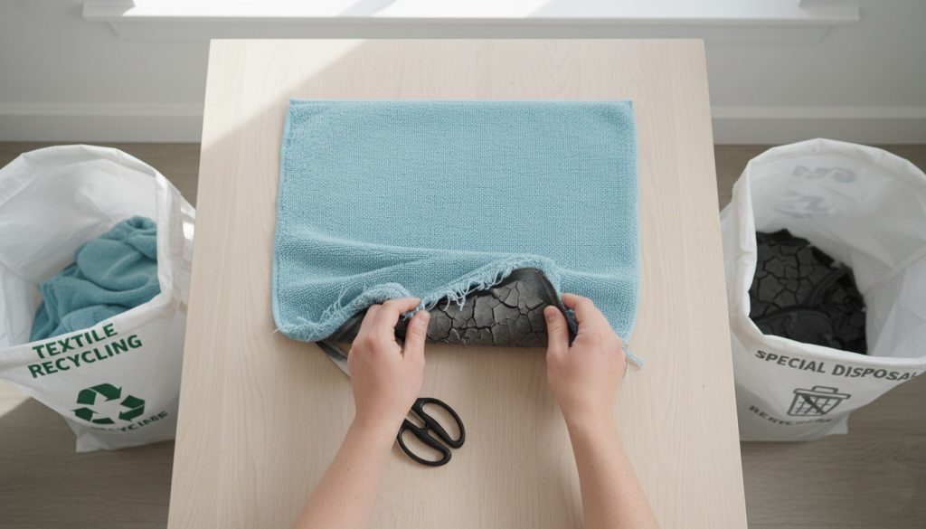 The rubber-backed mats require more effort, and honestly, this is where I’ve gotten creative out of necessity. Since most places won’t take them intact, I’ve learned to separate the layers. Using heavy-duty scissors (this is not a job for your fabric shears), I cut away the rubber backing from the textile layer. It takes about fifteen minutes per mat, and yes, it’s tedious. The cotton part can then go to textile recycling, while the rubber… well, that’s still a challenge. Some areas have programs that accept rubber products separately, but I haven’t found one locally yet.